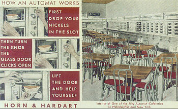 Horn & Hardart automatThe wonderful Horn and Hardart Automats, which were like self-service toy shops in which food appeared seemingly by magic in little glass windows, are gone. Likewise, Schrafft’s, a chain of lunchrooms (I don’t believe they were in Upstate New York) where my grandmother would meet other ladies, clad like her in Chanel-inspired suits and white gloves. They’d eat nondescript, refined and not very memorable food followed by yummy ice cream; those visits displaying eating as an assertion of taste and class, as it so often is.  Even if Schrafft’s itself didn’t exist up here, however, I’d bet there was something similar. But unless you count Starbucks for its shine and chrome, and I wouldn’t, the automats have not been replaced.  And neither has Schraffts’s.
