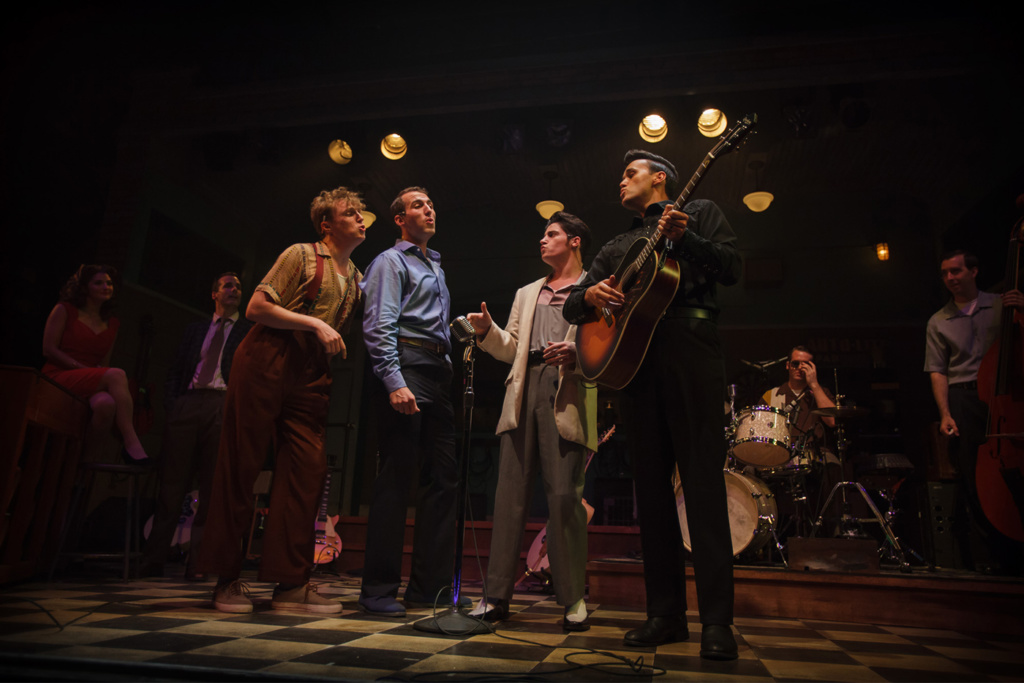Director Scott Weinstein prudently guides the show away from some looming snares. These are not mere tributes or imitations of nascent rock icons in their youth. No, no, not another Elvis imitator, paunchy in sequined jumpsuit, drawling, “Thank you, thank you verra much.” Instead, Luke Linsteadt, a bit shorter than the King himself, looks the least like the character he’s playing of the four. It’s a bold ploy. Even though Presley had signed with RCA Victor Records by this time, and had released his first huge hit, “Heartbreak Hotel,” he was little more than an adolescent and did not dominate the others.