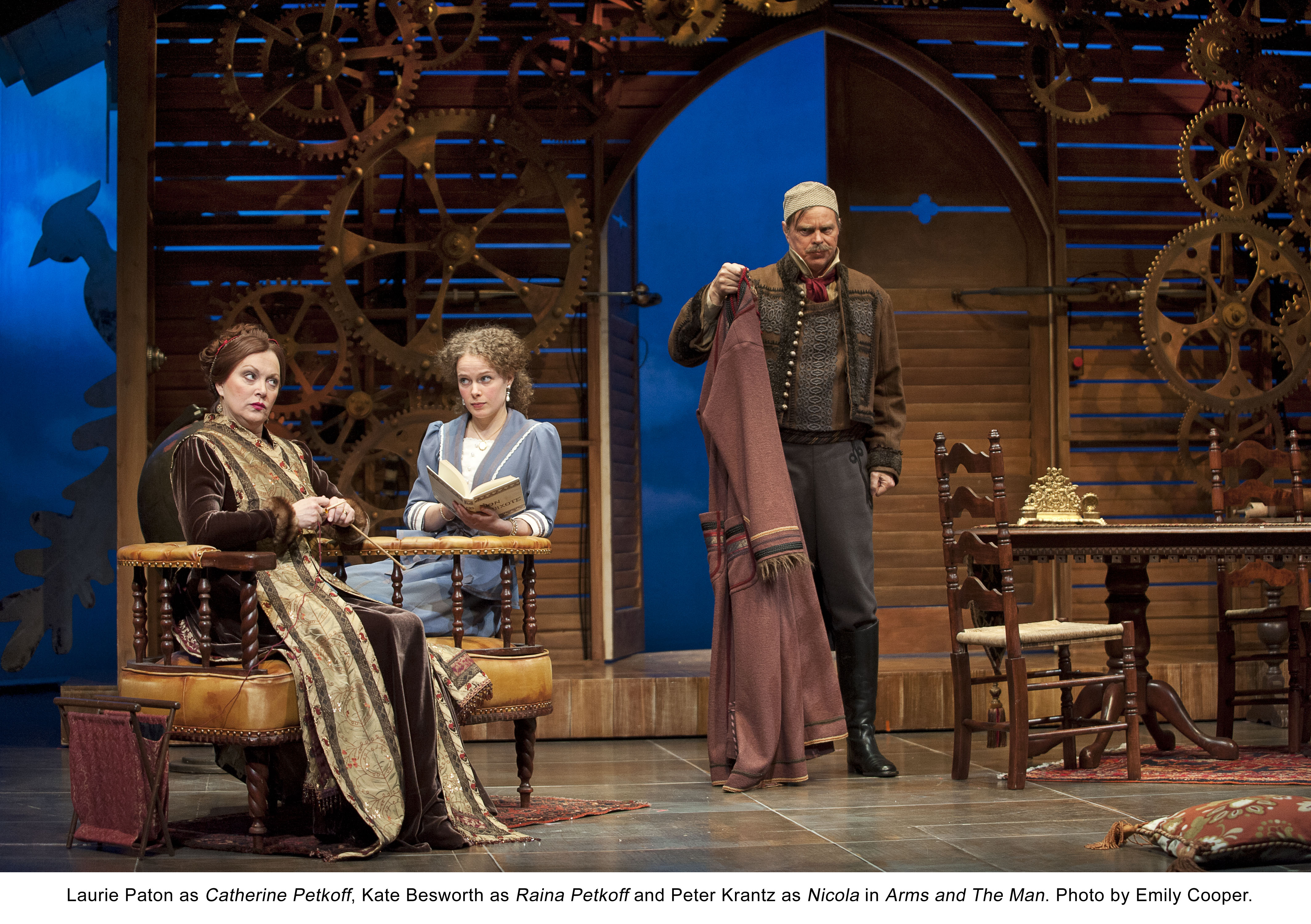 To give a new spin to such a familiar work, the festival assigned Arms to director Morris Panych, who has now been in Niagara many summers. Panych is one of Canada’s best-known comic playwrights, whose work has been well received in Central New York (such as the Redhouse’s May 2012 mounting of Vigil). At the Shaw Festival, however, his record is spotty. He once destroyed one of the greatest of all farces, Hotel Paradiso, by making playwright Georges Feydeau a part of the action. His innovations here are not so counter-productive, but their success is mixed.
