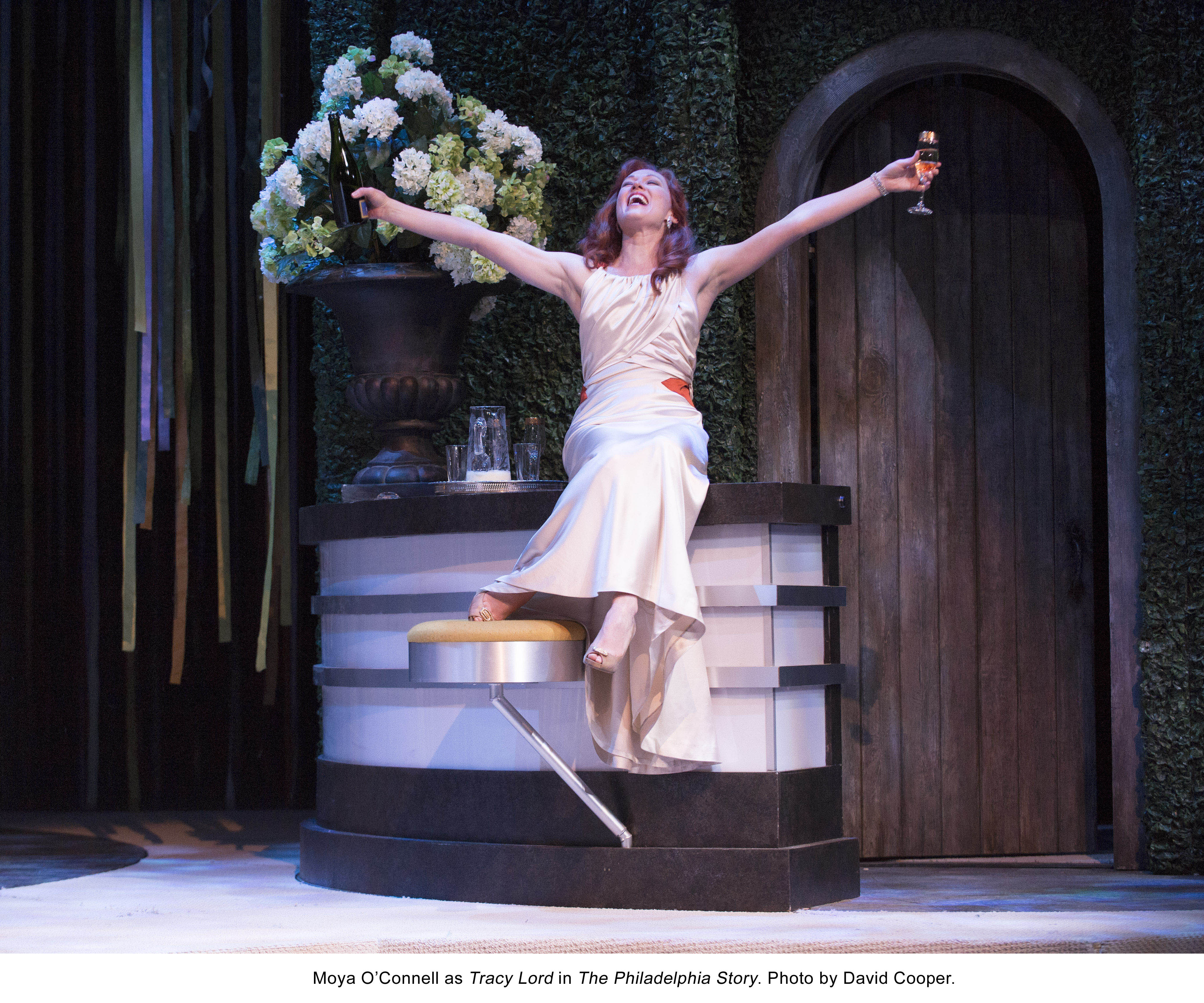 Although Barry based the play on an episode of a high society friend who unwillingly found her second wedding photographed by Life, Barry composed every line and scene with his friend Katharine Hepburn in mind. She was a Bryn Mawr girl with a Connecticut accent. As coltish debutante Tracy Lord, Moya O’Connell sports a deep red wig and first appears in high-topped riding boots. She’s headstrong and independent, ready to marry successful businessman George Kittredge (Thom Marriott), after the failure of her first marriage to C.K. Dexter Haven (Gray Powell).