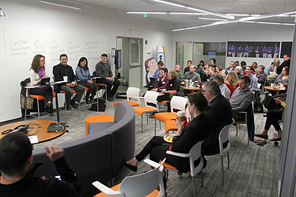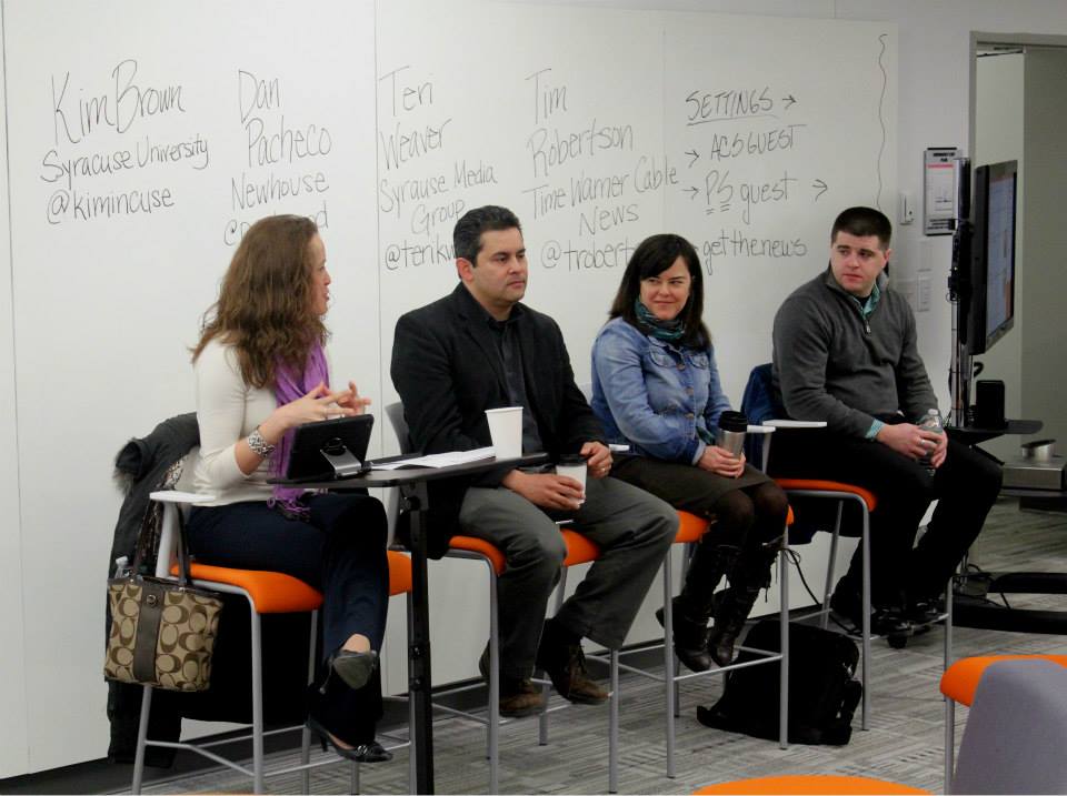 Last week’s program, co-presented with the Syracuse Press Club and hosted by Syracuse Media Group consisted of a panel of local journalism experts talking about the recent evolution of the business in the internet world and the impact social media is having upon the industry. Speaking were Dan Pacheco, professor and Horvitz Endowed Chair in Journalism Innovation at Newhouse; Tim Robertson, digital content producer for Time Warner Cable News; and Teri Weaver, government reporter for Syracuse.com; with Kim Brown, Newhouse professor and former News Channel 9 reporter serving as moderator.