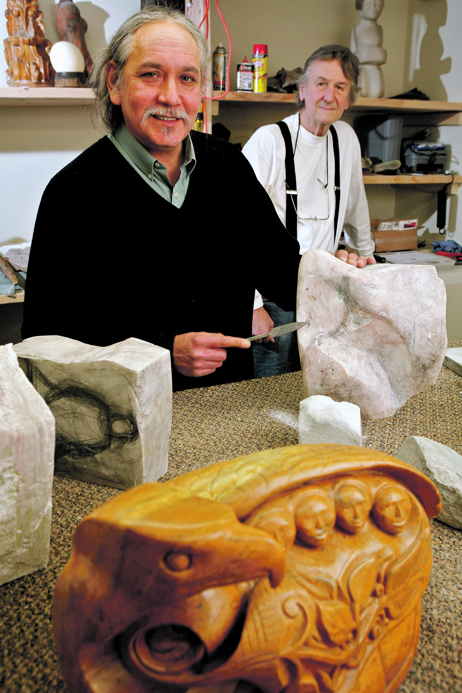 That’s Huff the storyteller, telling histories in stone. A small stone canoe sits high atop a shelf in Huff’s studio, surrounded by smaller carvings, clearly in a place of honor.