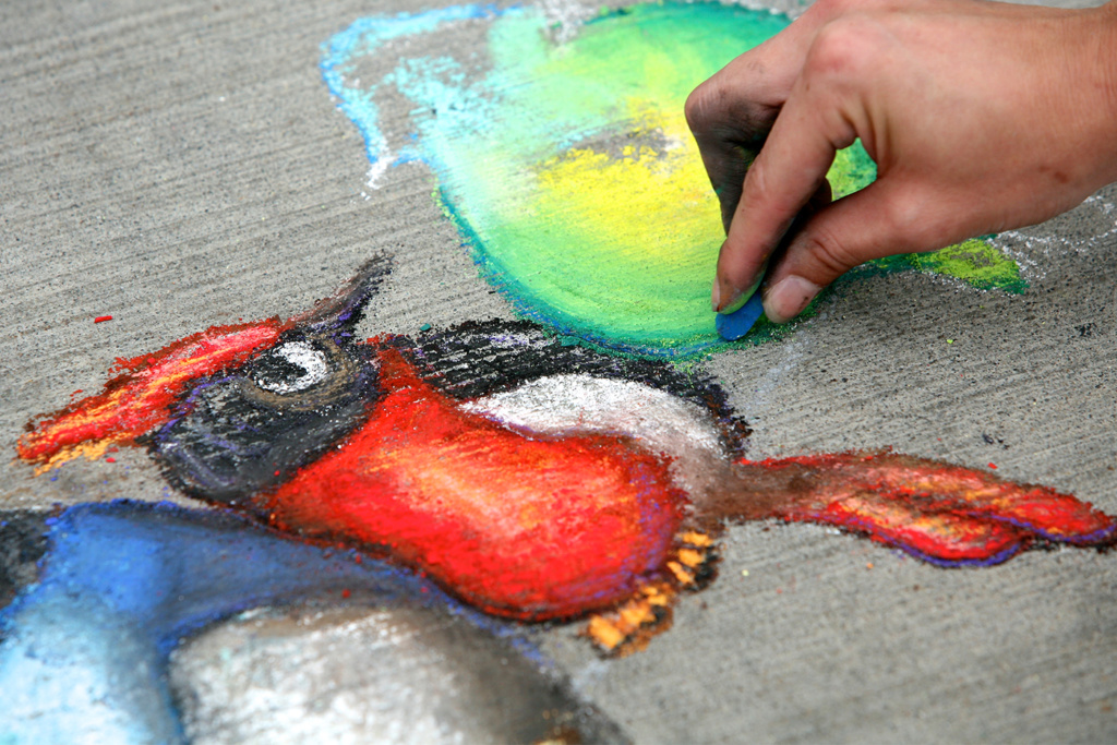 Here are a few Street Painting tips to be prepared: Don’t forget the sunscreen; knee pads will protect and keep those patellas padded; bring a spray bottle with water, because chalkboard erasers won’t work on pavement or hands; keep a towel or two handy to help with changing chalk colors; and aerosol hairspray will help seal the artwork and extend its lifespan.