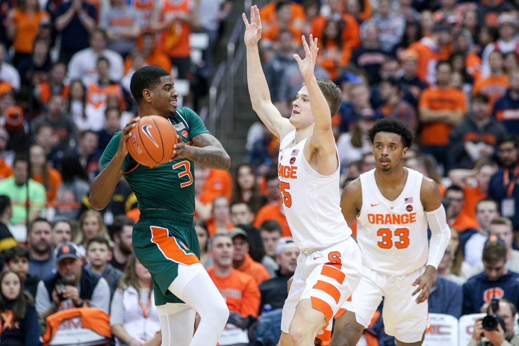 The Syracuse University men’s basketball team was firing on all cylinders Jan. 24 with its decisive win over the Miami Hurricanes, 73-53, at the Carrier Dome. Three-pointers made the difference, with the Orange nailing 14 shots from the outside. (Turnabout was fair play just two days later, however, when Virginia Tech’s Justin Robinson made nine 3-pointers to help defeat SU in an away game, 78-56.)