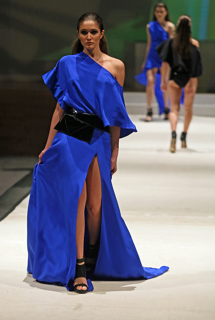 Syracuse University senior Lailee Waxman designed a dress shown at the SU Senior Collection Fashion Show at Goldstein Auditorium. The annual show presents the work of seniors in the College of Visual and Performing Arts fashion design program.