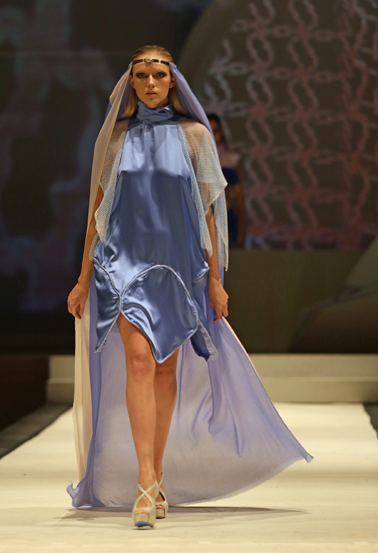 Syracuse University senior Lailee Waxman designed a dress shown at the SU Senior Collection Fashion Show at Goldstein Auditorium. The annual show presents the work of seniors in the College of Visual and Performing Arts fashion design program.  Gloria Wright | Syracuse New Times