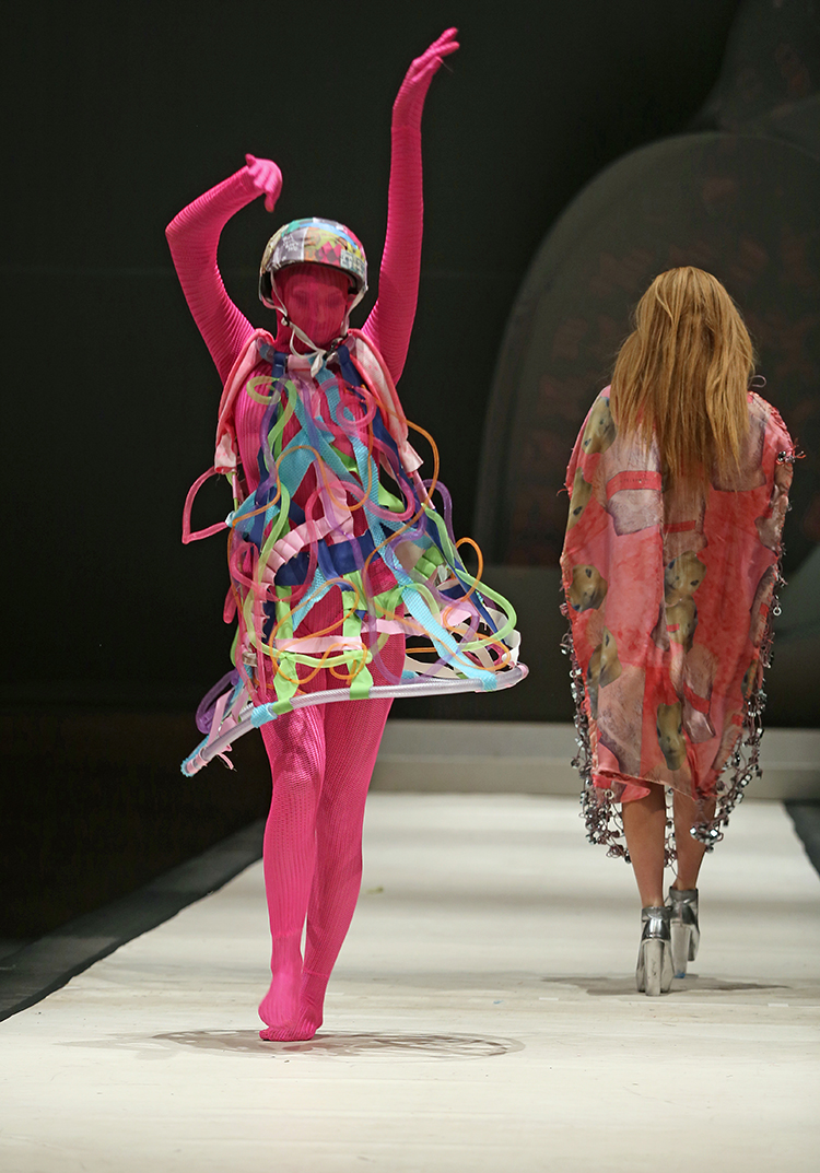 Syracuse University senior Sarabeth Fera designed an outfit shown at the SU Senior Collection Fashion Show at Goldstein Auditorium. The annual show presents the work of seniors in the College of Visual and Performing Arts fashion design program. Gloria Wright | Syracuse New Times