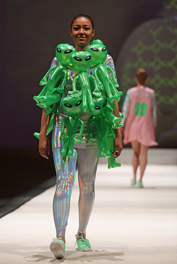 Syracuse University senior Emily Harrington designed an outfit shown at the SU Senior Collection Fashion Show at Goldstein Auditorium. The annual show presents the work of seniors in the College of Visual and Performing Arts fashion design program.  Gloria Wright | Syracuse New Times