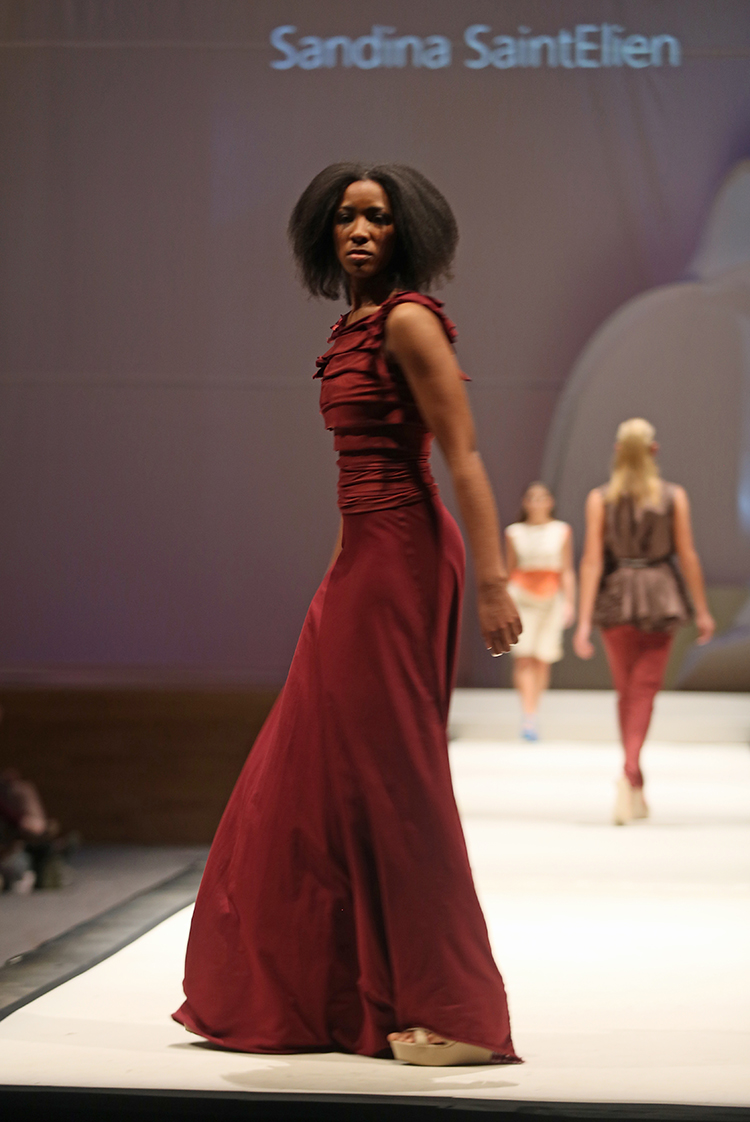 Syracuse University senior Sandina SaintElien (CQ) designed a dress shown at the SU Senior Collection Fashion Show at Goldstein Auditorium. The annual show presents the work of seniors in the College of Visual and Performing Arts fashion design program.