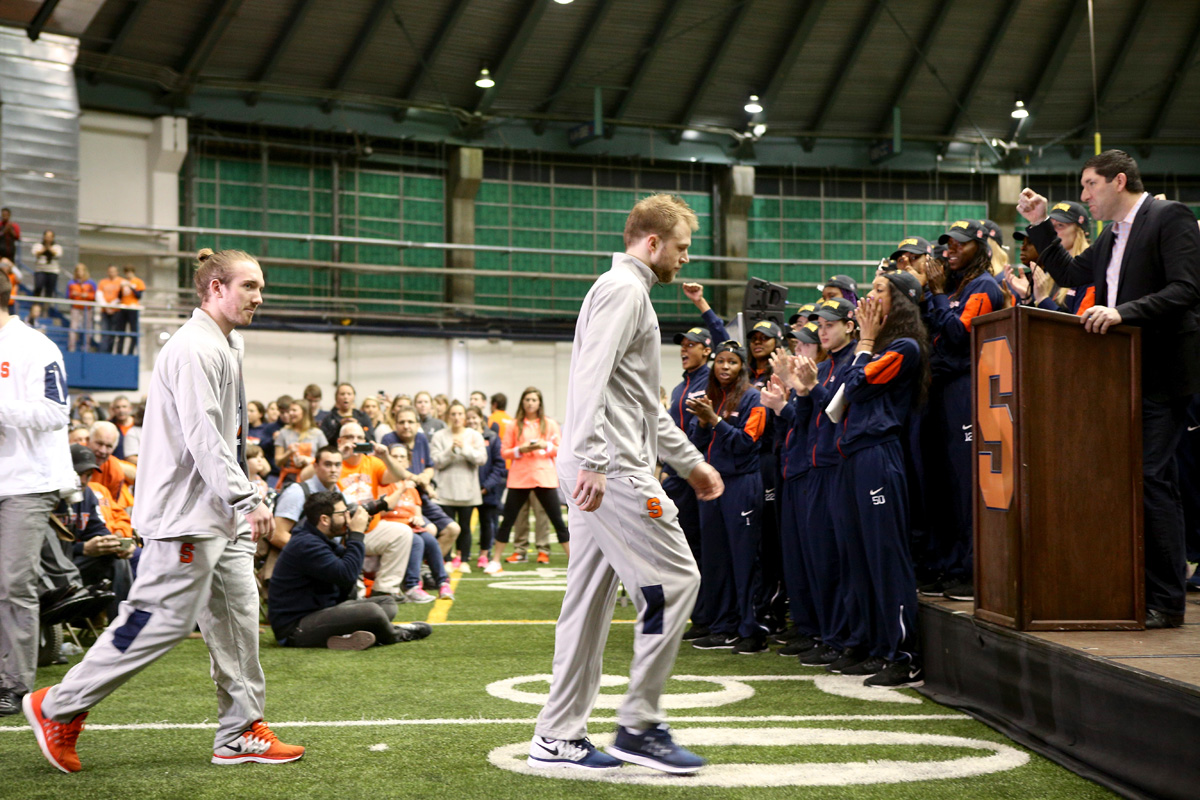 On Wednesday, March 30, the members of the Syracuse Orange men’s and women’s basketball teams held a pep rally at Manley Field House to celebrate both squads making it to their respective Final Fours.