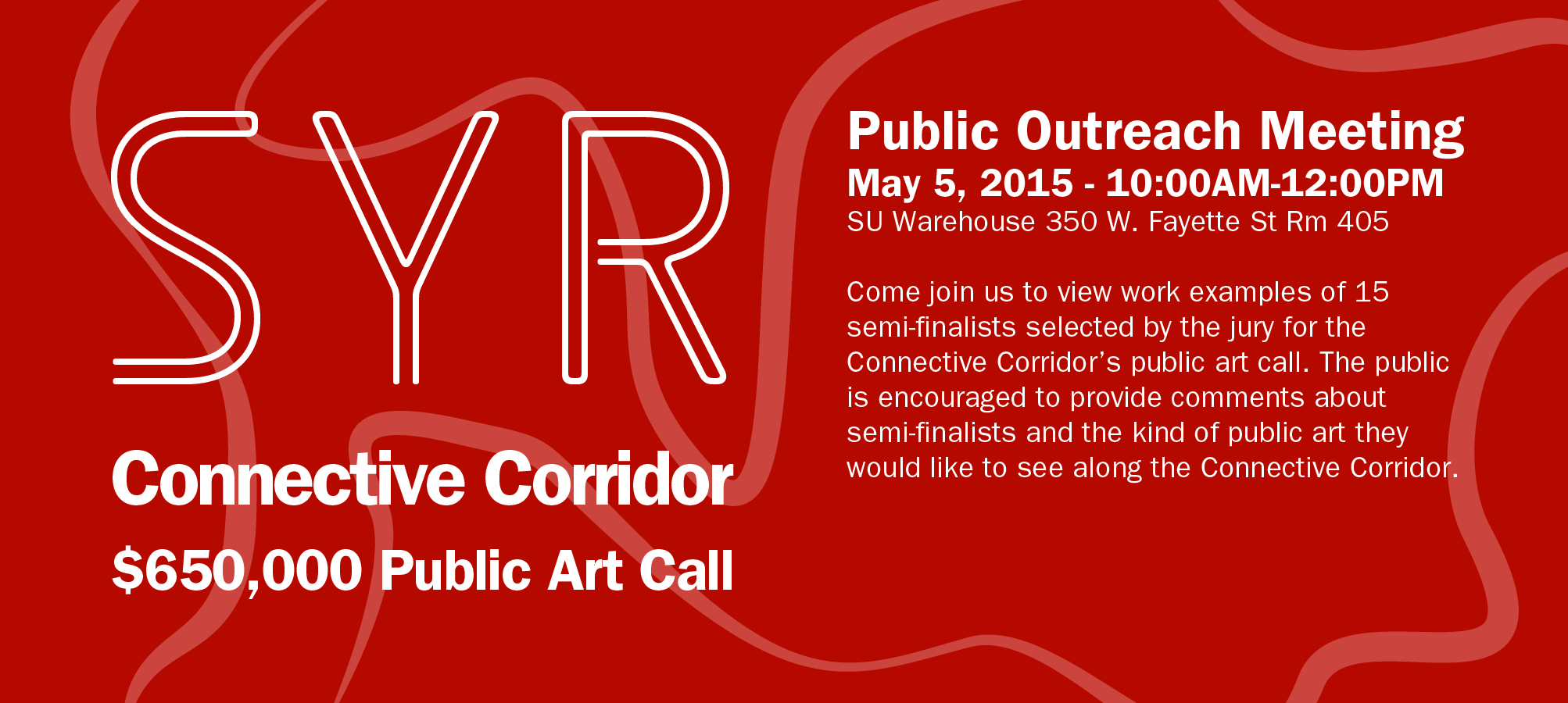 We invite you to continue the conversation. During the month of April, the jury is narrowing their selections from 276 applicants to 15 semi-finalists for the Connective Corridor’s call for public art, a collaboration with SU – VPA. We invite you to a public outreach session, May 5 from 10 a.m. to noon at the SU Warehouse, fourth floor conference suite, so see works examples by artists being considered by the jury. This is your chance to provide input. It will be an interesting conversation about how we use this project to both commission public art, and build identity for Syracuse as a place where the arts play a leading role in re-imaging Syracuse’s future.