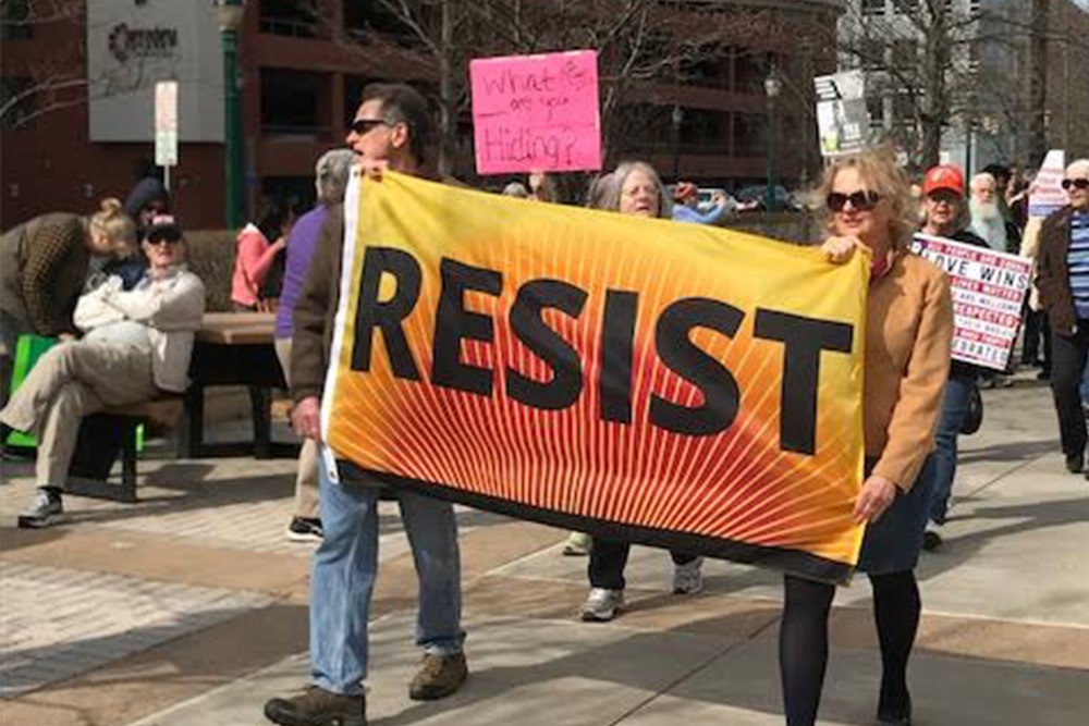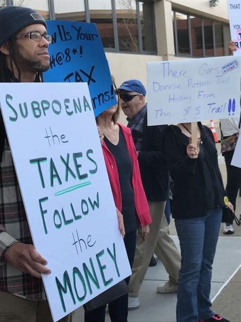 “We all have to show our money,” said Eric van der Vort of the CNY Solidarity Coalition, one of several local groups that have organized events opposing Trump’s administration and policies. “What we’re here to say is that people are also holding him (Trump) accountable. We need to see his taxes.”