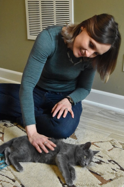 The sun sets outside the window of the little room off of Courtney Armbruster’s finished basement. The door closes behind her as she looks around for Smokey and Boots, the two kittens she is currently fostering. A pitter-patter of paws came from the scratching post in the corner of the room. The two kittens are a ball of tangled legs and tails as they try to reach Armbruster on the rug. She gathers the kittens, who are flailing with excitement, and smiles down at them. “We do this so cats and kittens, like these two, will find a great home and a great future.”