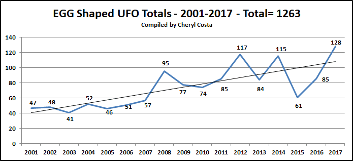 Many social media readers have asked me to “show them a trend.” OK, note the black line suggesting more than a 300 percent increase of these egg UFO sightings in the past 17 years. It’s something to think about, especially when you consider that of 28 of the known UFO shape categories, 25 are in steep decline these past three years.