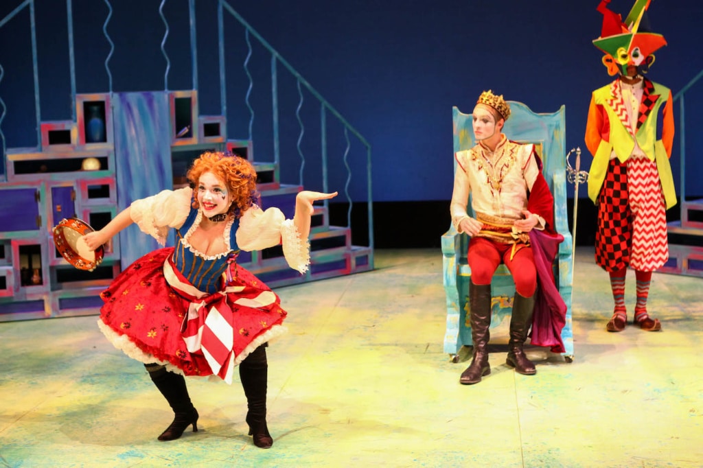 Handsome but lonely, Deramo seeks young ladies willing to audition to be his bride. Ambitious patrons push their favorites. First Minister Tartaglia (Mario Marques) has to tear his reluctant daughter Clarissa (Sarah Hubner) away from her true love Leander (Crawford Horton) to make a faltering play for the Prince’s approval. The ambitious striver Brighella (Allisha Edwards) hustles up his cousin Smeraldina (Kara Cooper), who is smitten with the buffoonish bird-catcher Truffaldino (Emily Bollman). Smeraldina makes her futile play by turning a somersault before the Prince. Finally, the elderly, barely mobile Pantaloon (Sarah Herrman) invites his ballerina daughter Angela (Adriana Schaps) to go up — almost — en pointe to make the family case. It works. And the furious Tartaglia vows revenge.