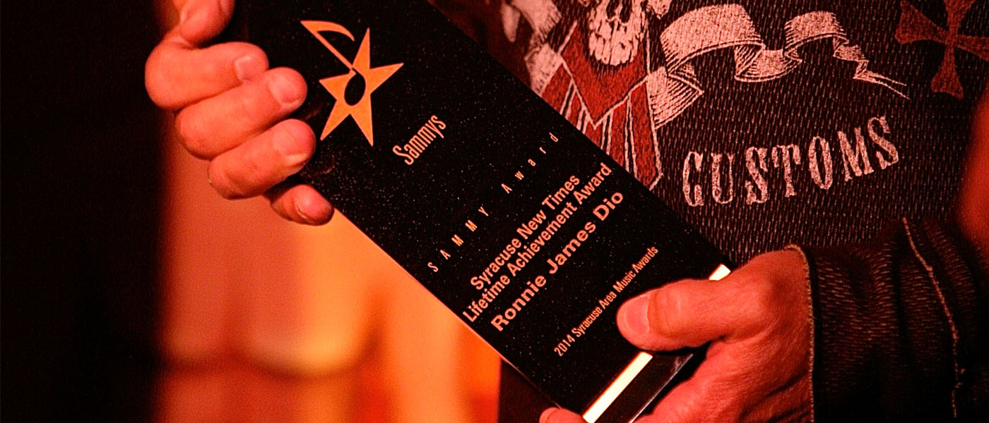 The evening ended with the Lifetime Achievement Award, as local music historian Ron Wray lauded the late Ronnie James Dio, an entertainer known around the world, although his roots were in Cortland. He gave a full history of Dio as a performer and as a person and acceptors on the stage included Dio’s son, Dan Padavona, Dave “Rock” Feinstein (inducted in 2011) and the internationally known Mickey Lee Soule. However, it was Padavona’s final words that wrapped the ceremony perfectly, once again hitting on the theme that had underscored the night.