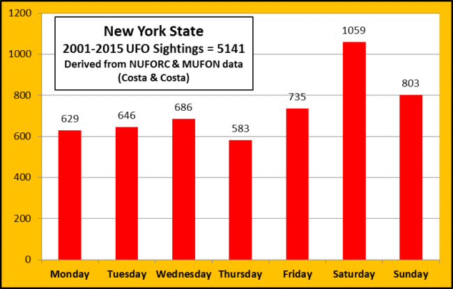 Of course the common reasoning for the Saturday and Sunday uptick in sightings is perhaps because most people have the weekend off, therefore more time outside for sky watching.