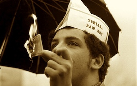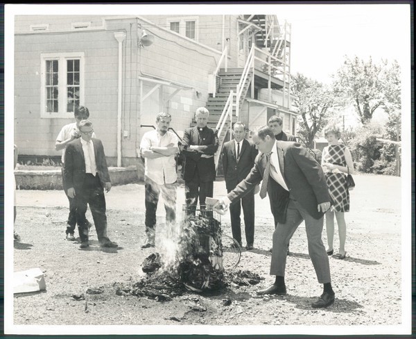 Tom Melville puts more fuel on the burning draft cards at the Selective Service office in Catonsville on May 17, 1968. Photo: Baltimore Sun