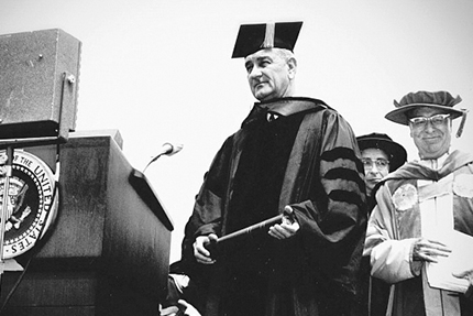 President Lyndon B. Johnson attends the Newhouse 1 dedication, August 5, 1964, where he delivered the Gulf of Tonkin Speech, a reiteration of his televised talk to the nation the previous night. Two days later, the House and Senate passed the Tonkin Gulf Resolution, allowing the president to escalate U.S. involvement in the Vietnam War. (Photo: sumagazine.syr.edu)