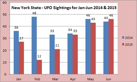In terms of UFO sightings in New York State, 2015 is off to a slow start. Sighting numbers for January through June are clearly down. UFO sighting reports for New York from both reporting services are down a solid 25 percent, as compared to 2014.
