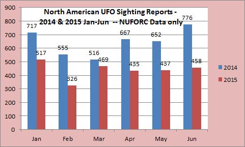 But beyond New York State, the story is much bigger. North American UFO Sighting reports are down 32 percent from last year. Using National UFO Reporting Center data only, 2014 logged some 3882 UFO sighting reports for the first half of the year. 2015 is reporting only 2642 sighting reports.
