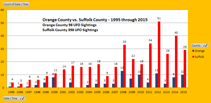I am going to put this issue to bed, once and for all. Below is a bar graph using National UFO Reporting Center data. I sampled the 20-year window from 1995 to 2015. For the sample period, Suffolk County reported 398 UFO sightings, while Orange County had only a quarter of that at 98 sightings.