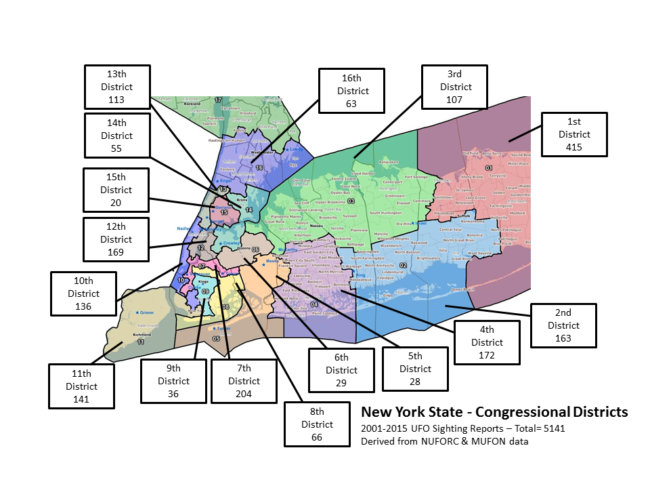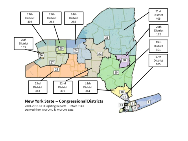 As you can see from the data presented, there are many New York congressional districts that have large amounts of eye witness UFO reports.
