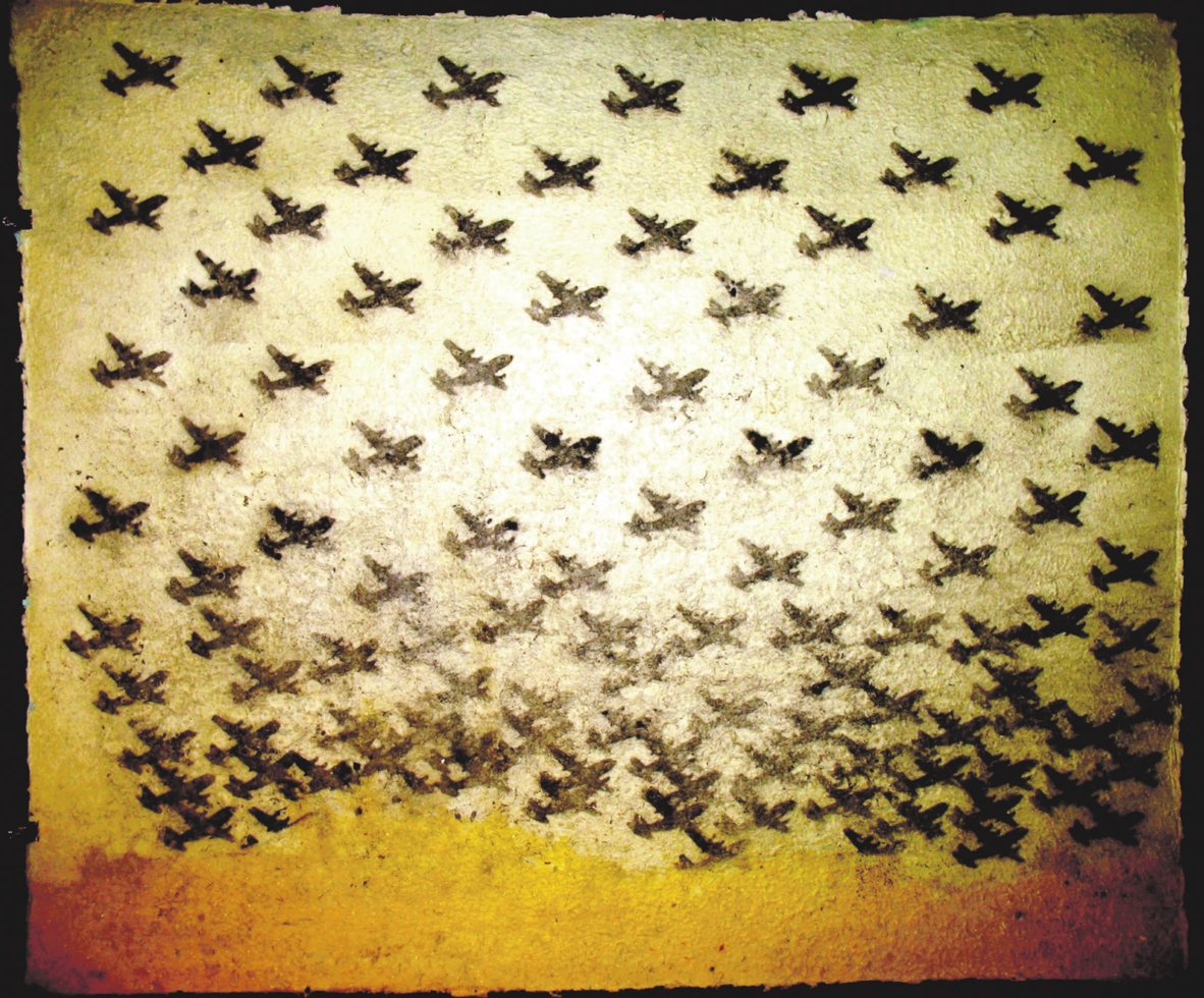 Elsewhere, the show presents Nick Raven’s silkscreen portraying a soldier next to camels, John LaFlage’s pulp painting on paper depicting dozens of tiny warplanes, and Donna Perdue’s “Amani, My Culture,” a large black-andwhite image of a woman wearing a veil.