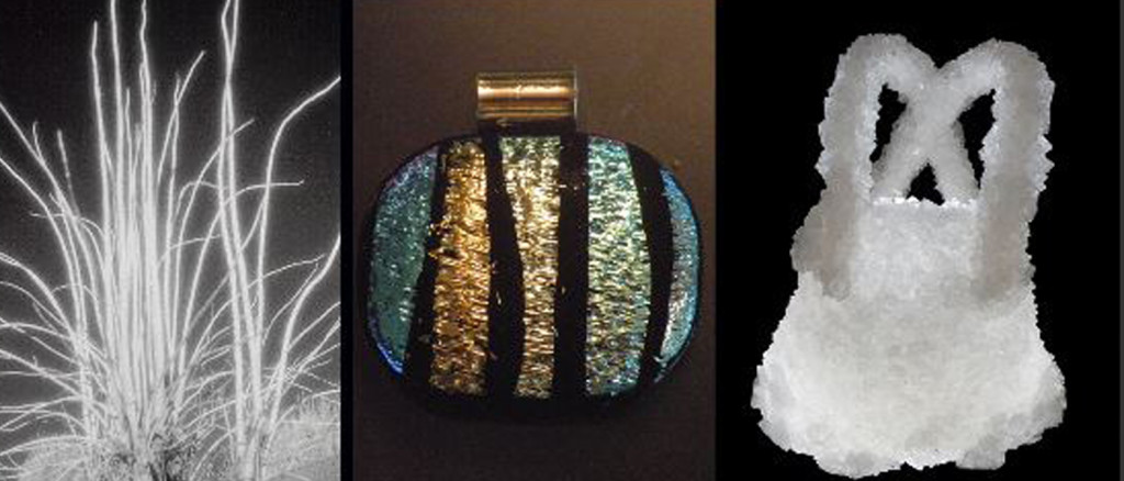In addition, she has grown crystal pieces, beginning with a bath of super-concentrated alum in deionized distilled water. Some of her crystal works in the current exhibit are clearly figurative, depicting items such as a sundress, shorts, and children’s shoes, while others don’t have a figurative element.