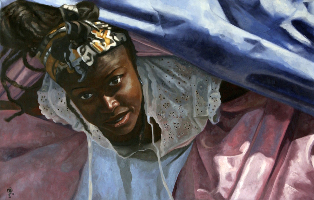 Artist Nina Buxenbaum is a woman of biracial heritage, the child of African-American and German-Jewish parents. Her pieces, done in mixed media or oils, stress the notion that identity is complex. Several of them portray two women, as in the work where a white woman touches the hair of an African-American woman. In a second work, two woman interact; very near them there’s a blue-colored doll.