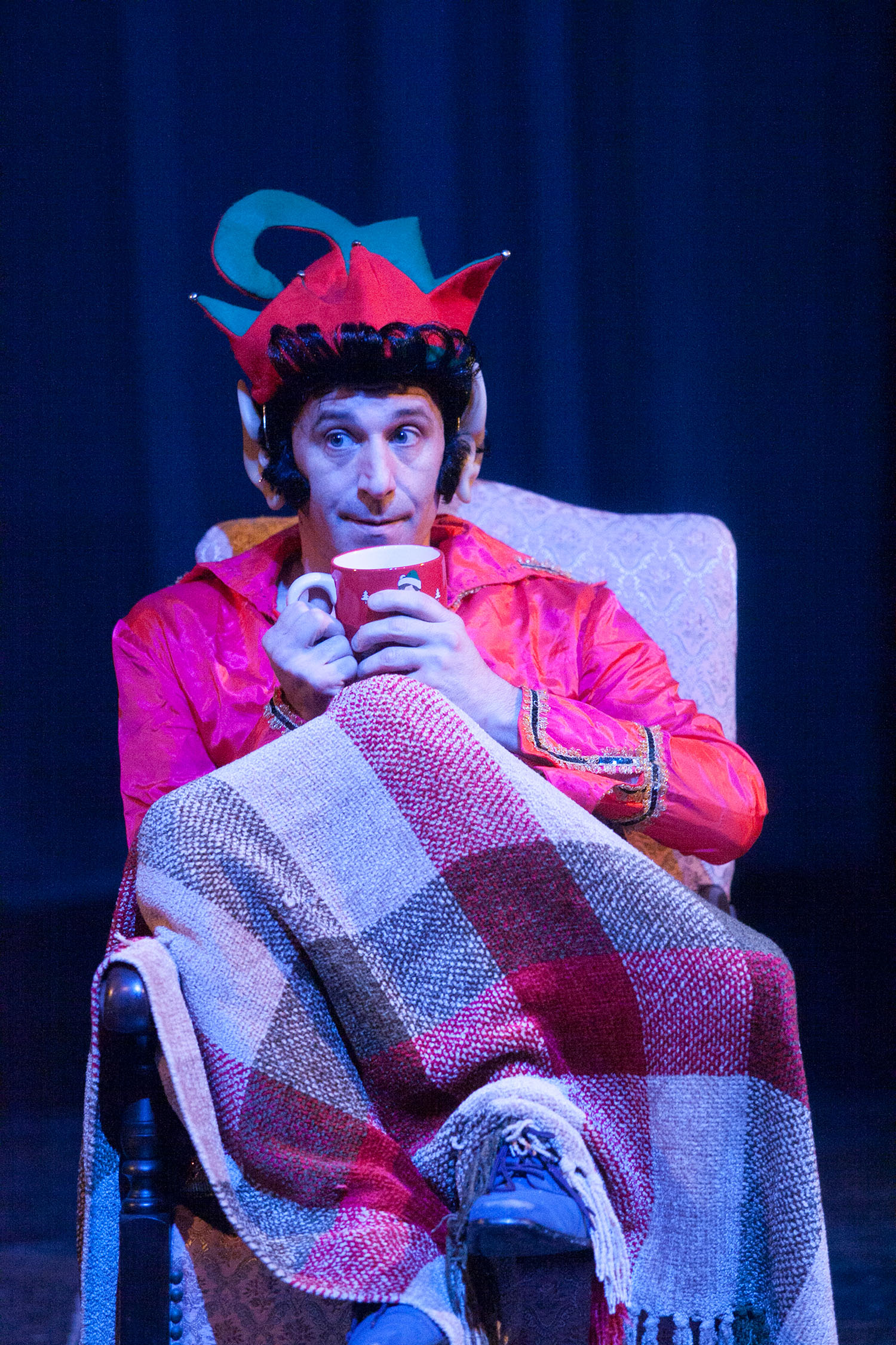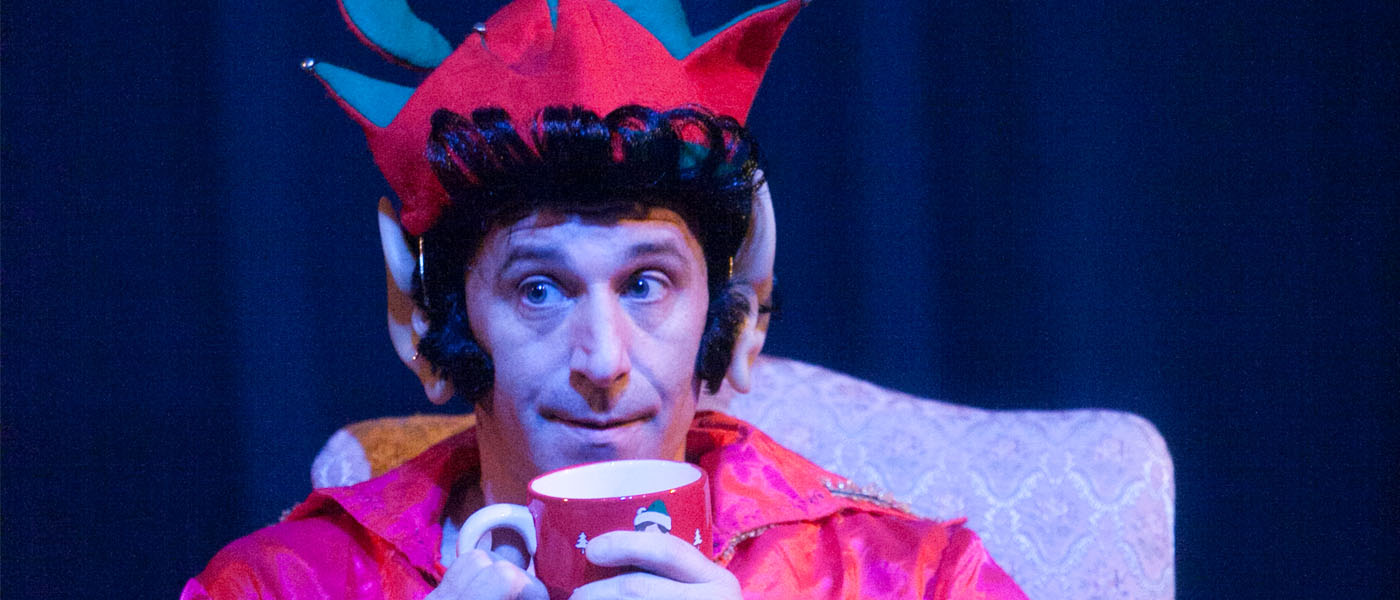 The narrative begins with variations on familiar elements. Santa Claus (Edward Mastin), with a trim beard and a flat tummy, is an all-business CEO with semi-reliable employees. Insouciant reindeer Prancer (Darian Sundberg), with antlers and a black nose, had been snooping through the Naughty and Nice printouts before the Big Man arrives, leaving reindeer hair in his chair. Even before they started talking, a big-eared elf with a mop of black hair has been prowling the set, peaking in windows and checking out the way children behave. His name is Elfis (Jimmy Wachter), and, yes, he’s wearing sequined bell-bottom trousers, and is given to riffs on the Ghost of Graceland.
