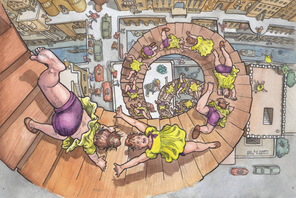 In larger works, the artist wanders even further afield. “Cannonball Boulevard” depicts classic cars driving down a long roadway with spectators including birds, dogs and an alligator. “Motor City Missy” integrates several elements: women driving motorcycles, raucous onlookers, futuristic buildings, people in airplanes and other air vehicles watching the competition. A third piece, also with touches from the future, shows people swept into the air toward the Moon Beam Cafe.