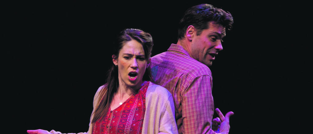 Jesse Bush, active at both Kitchen and the Hangar Theater, where he is associate artistic director, is something of a star in Ithaca. Audiences are used to his coming up with the unexpected, like an expert Afrikaans accent in J.T. Rogers’ The Overwhelming or singing of cannibalism in Sweeney Todd. For the intensity of his Lungs portrayal he has never been asked to deliver more.