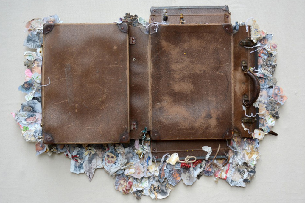 In a mixed-media construction, he’s turned out a small suitcase and surrounded it with postage stamps and images of people on torn-out pieces of paper. The work speaks to travel, various interactions, even stages of life. It’s accompanied by a brief poem: “Living the life of one-act plays leaves little time for extended stays.”