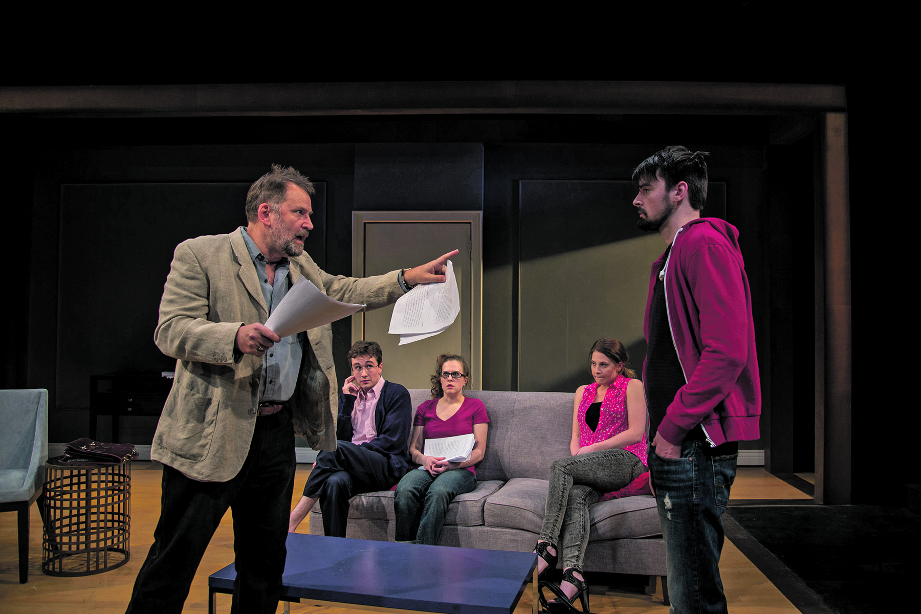 Brian Dykstra, Matthew Bretschneider, Dana Berger, Alex Sunderhaus and David McElwee in Kitchen Theatre’s Seminar. Photo by Dave Burbank.