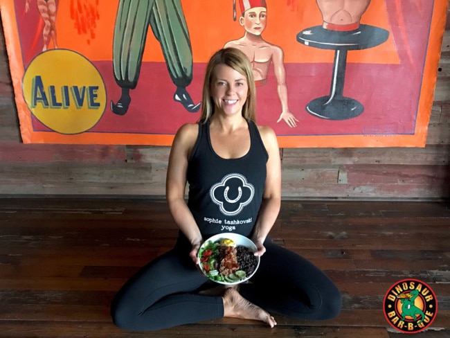 The Dinosaur event begins with an hour of yoga in the upstairs private event space, followed by a meal that showcases a healthy, new menu item. The Black and White BBQ Bowl is a composed dish of black beans, rice, mixed salad, Creole deviled egg, toasted pumpkin seeds and grilled cornbread, with your choice of pulled pork or chicken, beef brisket, tofu or mushrooms.