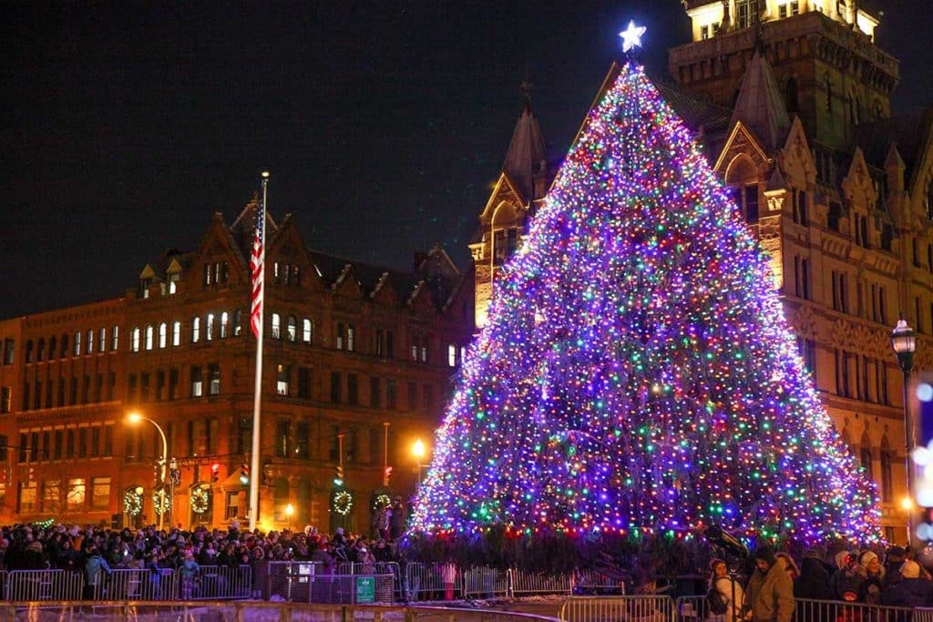 The yuletide season doesn’t really begin in Central New York until the Christmas tree lighting ceremony takes place at downtown’s Clinton Square, as throngs of frigid onlookers gathered for the annual post-Turkey Day festivities on Nov. 23. Syracuse Mayor Ben Walsh got his first chance to flip the switch, and this year he was accompanied by movie actor Ian Petrella, who portrayed annoying kid brother Randy in the 1983 holiday classic A Christmas Story. A visit by Mr. and Mrs. Santa Claus, musicmakers making merry and displays of ice skating rounded out the evening.